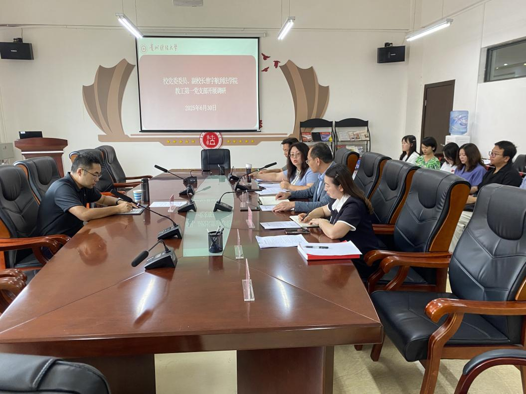 (法学院 杨森井 张姝报道/摄影)2025年6月30日下午,贵州财经大学党委委员、副校长曾宇航到工作联系点法学院教工第一党支部开展调研指导,并与支部党员教师座谈交流。支部党员、法学院党委书记邵新顺、党委副书记彭华、副院长兼支部书记宋昭澜及支部党员教师共20余人参加。会议由宋昭澜主持。