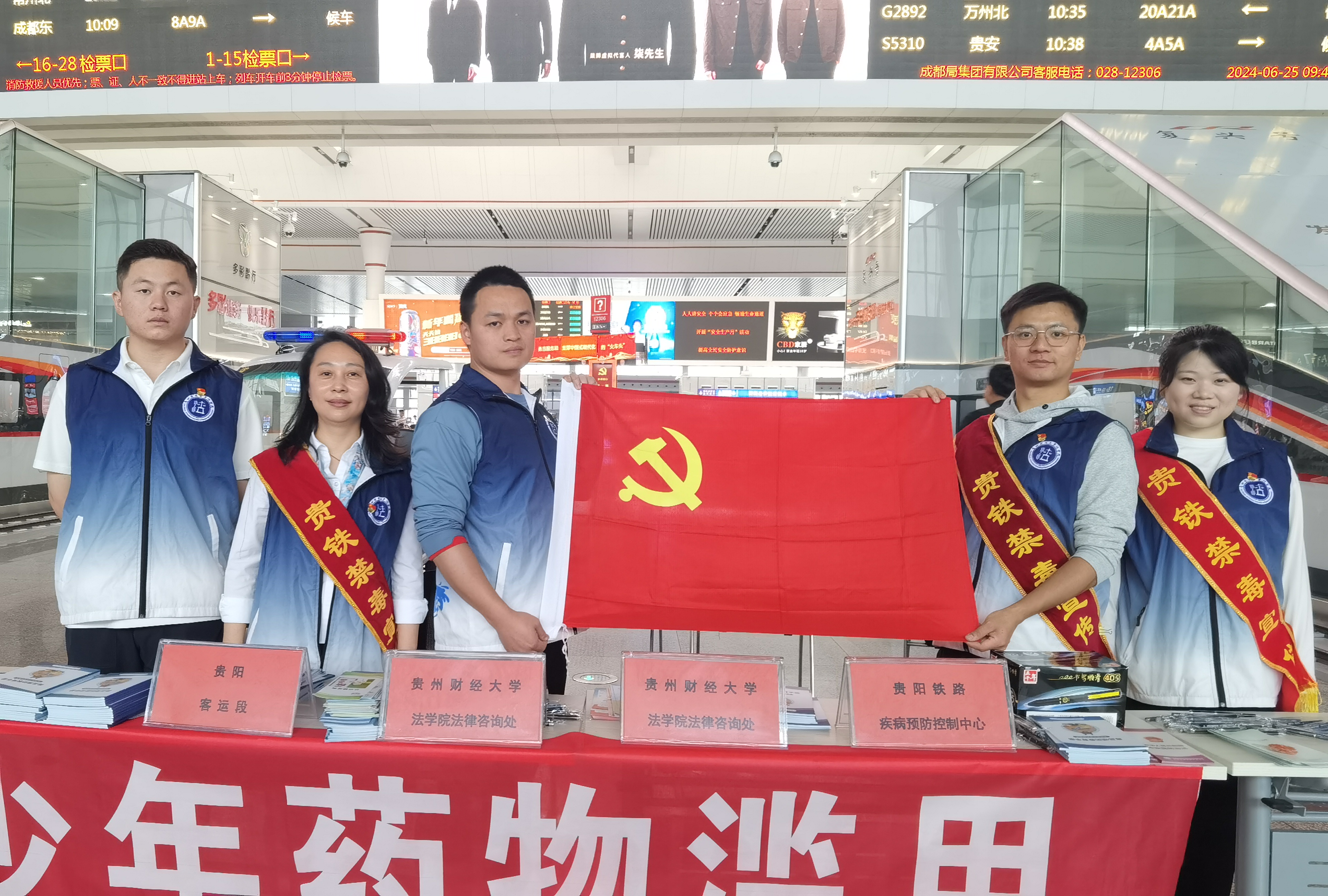 (法学院 冯青青 报道|摄影 胡健)6月25日,在第37个“6.26”国际禁毒日来临之际,法学院教工第二党支部教师党员代莉莎,研究生第一、二党支部硕士研究生党员陈磊、相浩天、胡健、冯青青积极行动,响应禁毒号召,在贵阳北站向旅客进行禁毒普法宣传。