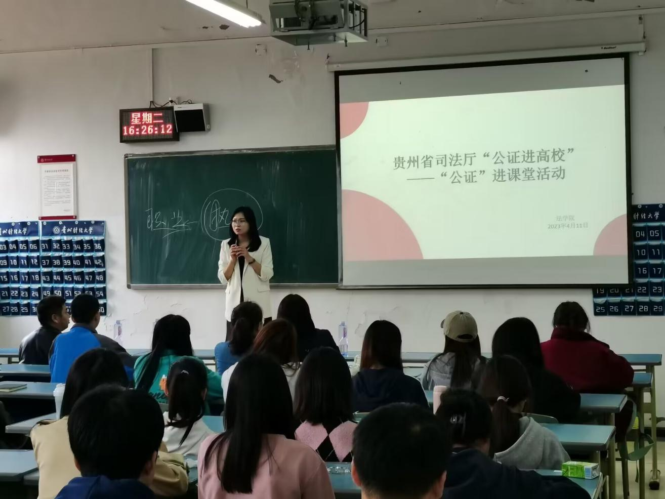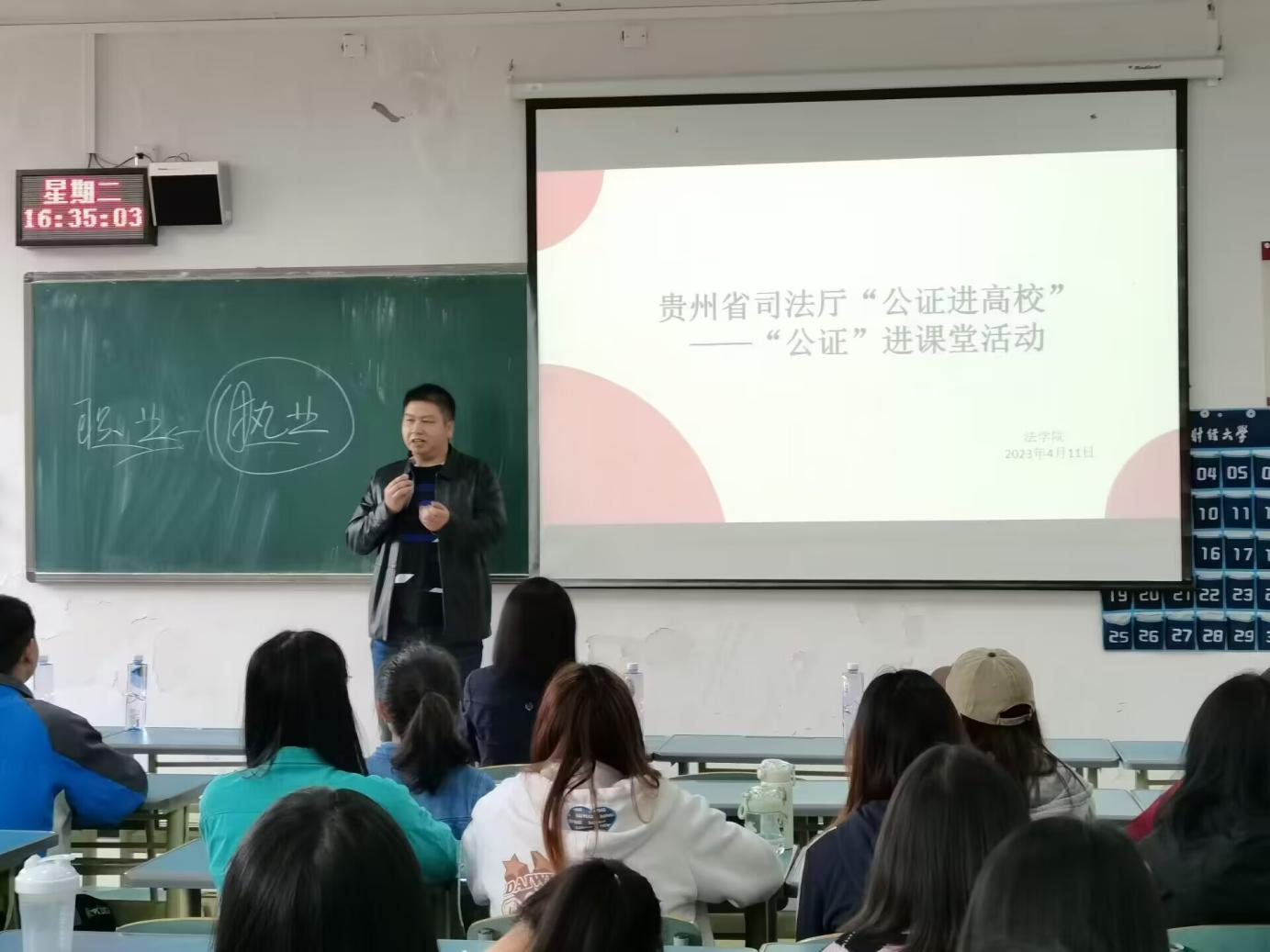 (法学院 图文/报道 张显薇)2023年4月11日下午两点,od平台官方官网120名学生在博学楼2-19教室参加了贵州省司法厅“公证进高校”活动。贵州省司法厅公共法律服务管理处三级调研员申状平,贵阳市公证协会第三届理事会副会长兼秘书长龚燕婕,凤冈县公证处执业公证员、我院2013级法学专业优秀校友王克桃参与此次活动,法学院党委副书记、院长陈玉梅主持。