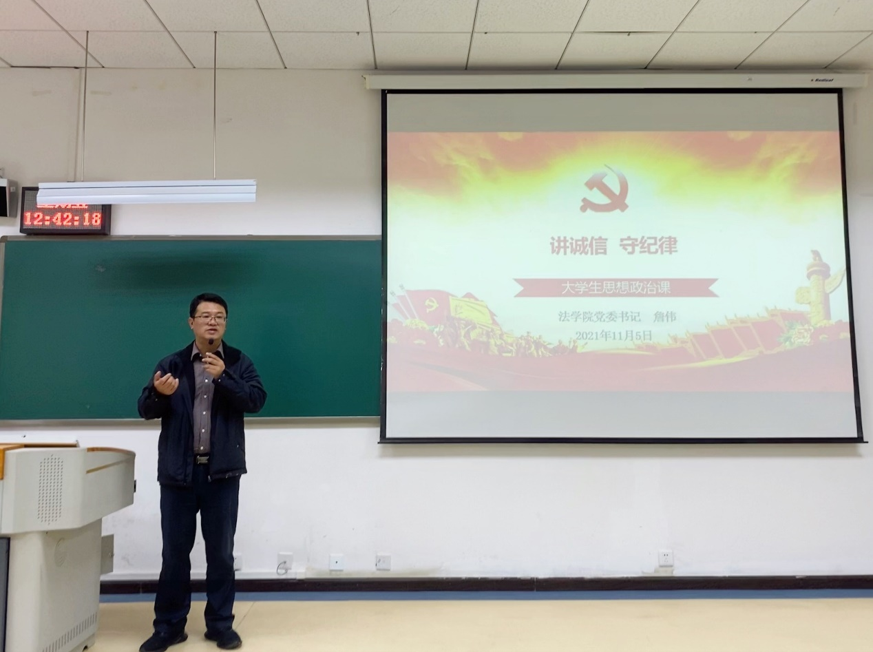 (法学院 图文/报道 杨洁芮)为增强同学们的诚信意识,提升同学们的诚信规范,2021年11月5日中午12:30,法学院党委书记詹伟在乐学楼1-1教室上题为“讲诚信,守纪律”的大学生思想政治课,学院在校本科生、研究生共120余人参加。校学生工作部(处)蔡利红老师到场听课。