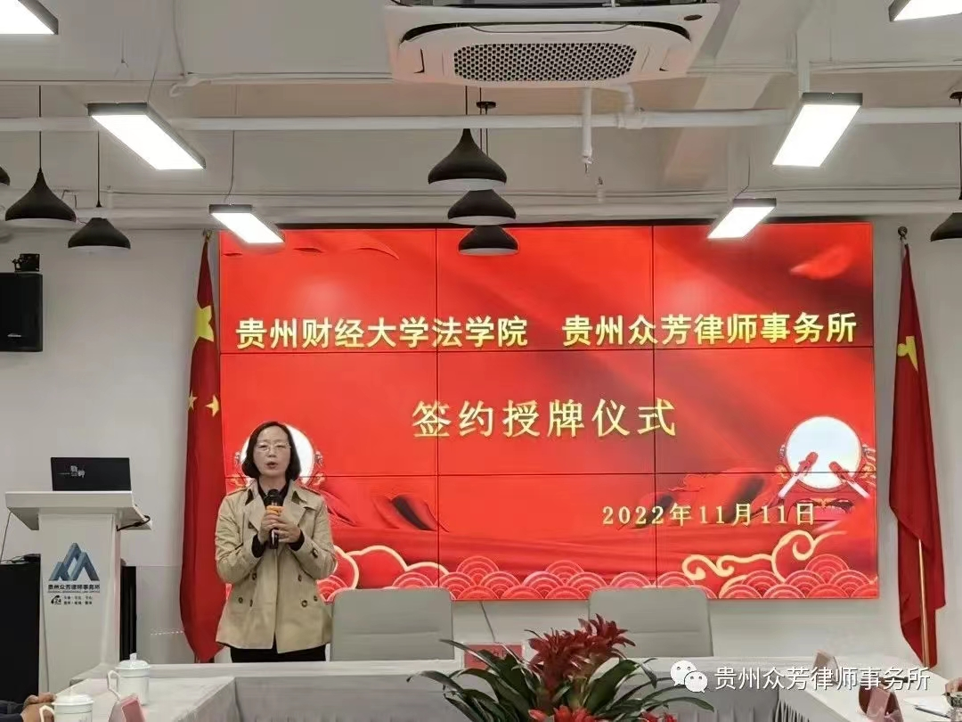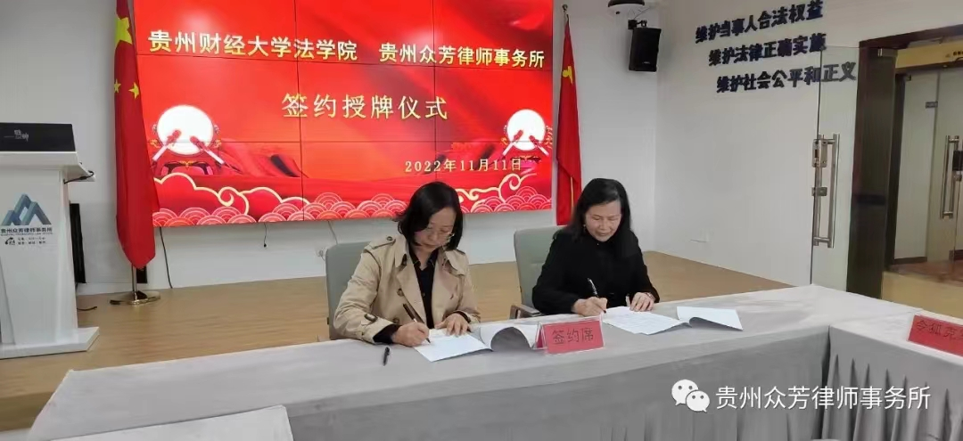 (法学院 图文/报道 张文友)2022年11月11日,od平台官方官网与贵州众芳律师事务所校外实践教学基地签约暨授牌仪式在贵州众芳律师事务所举行,od平台官方官网院长陈玉梅教授、副院长曹务坤教授、何鹏博士、贵州众芳律师事务所在所主任陈仕菊、执行主任朱飞等参加签约既授牌仪式,并举行了座谈。