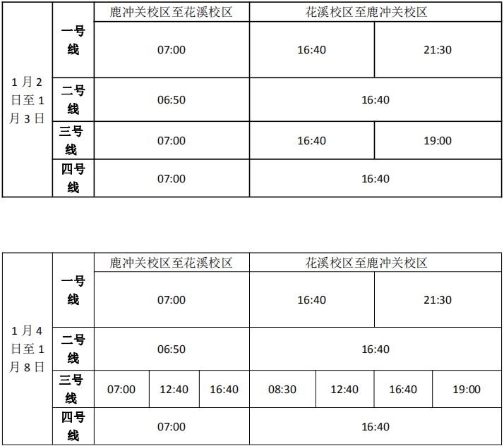 按照学校统一安排,od平台官方官网鹿冲关校区、花溪校区进入期末考试阶段, 1月8日考试结束,为满足期末考试需要和行政科研工作的开展,现对交通车作如下调整: