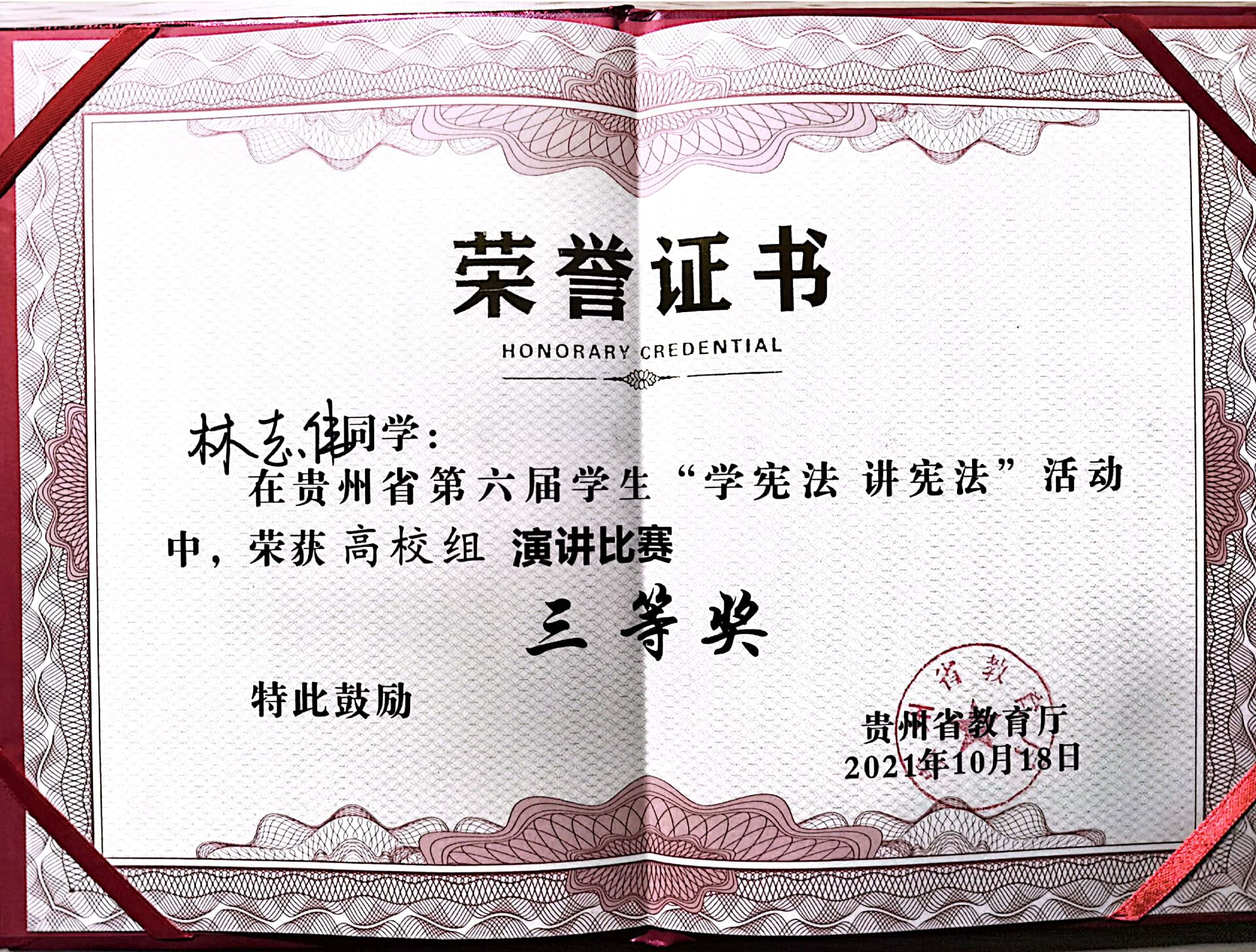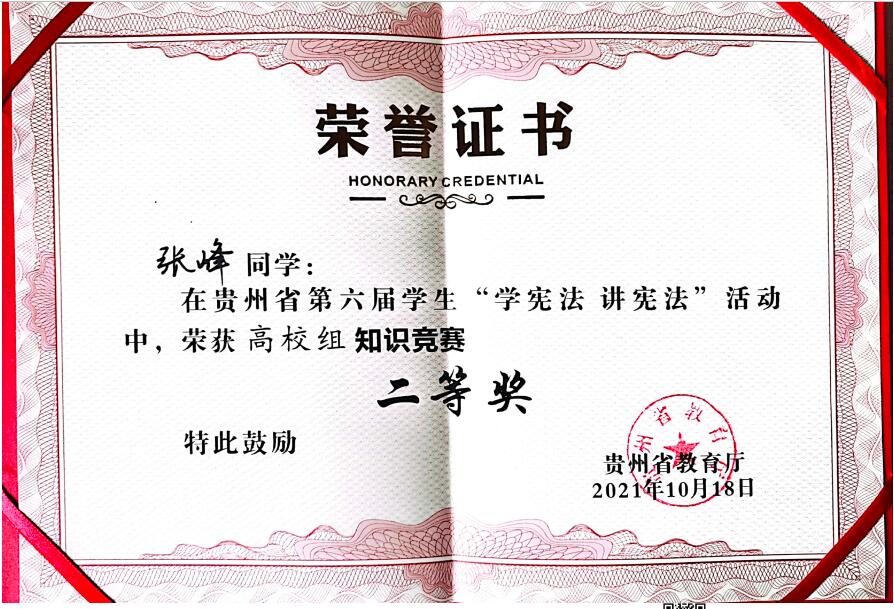 10月18日,由省教育工委、省教育厅主办,贵州民族大学承办的全省第六届学生“学宪法 讲宪法”活动总决赛在贵州民族大学举行,od平台官方官网法学院学子张峰、林志伟经过多轮激烈比拼后,晋级总决赛,同来自全省各高校的参赛选手进行角逐。最终张峰同学荣获知识竞赛二等奖,林志伟同学荣获演讲比赛三等奖。